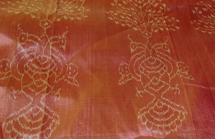 Amazingly, I left without buying anything, too overwhelmed by the beauty to even contemplate what I would want to own for myself. The next day, thinking of what fun Gunjan and Surya and I had together – talking of natural dyes, politics, Occupy Wall Street, anti-fracking rallies with my son, the whole range of topics in our lives – I thought what fun it would be to have dinner with them and Steve. Luckily, we were able to arrange this and returned to their home where I chose a fabulous, ikat saree, naturally dyed, with a tree of life ikat pattern – one of the most beautiful pieces of cloth I’ve ever seen – or owned. Also,a wonderful silk shawl in a traditional Odisha pattern. I should point out for the weavers among my readers, the work I’m describing is woven at 150 threads per inch, on two harness looms – which we might describe as “primitive” – with pickup! (These two pieces were in my stolen backpack!! Through the miracles of email I was able to contact Gunjan and she was able to send a very, very similar saree and shawl to Delhi so my broken heart could mend.)