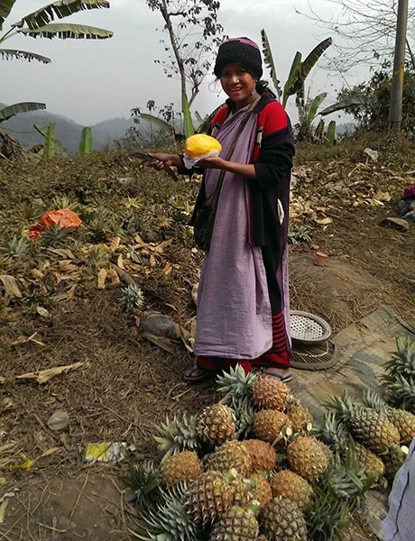 What we did see were women dressed in attire we’d never see anywhere else in India. Or at least, have never seen anywhere else. (See accompanying photo.) This area is deeply Christian – Protestant (Methodist!) and Catholic. The owner of the Cherrapunji Holiday Resort lent me a book about the influence of the Welsh who had proselytized in this area – hymns are still sung in Welsh! On our drive through this lovely area which has been compared to Scotland and Wales, we stopped for some fruit; the woman selling by the road was terribly disappointed that we were not Christian – believe me, we did not bother to say we were Jewish! She was wearing a gingham checked piece of cloth, a rectangle tied at each shoulder. When it gets cold out both men and women wear brightly checked woolen shawls that look as if they could have come from Scotland. We did not see any local weaving there – were told that people in this area had not been weavers but had traded honey and pepper for cloth woven nearby.